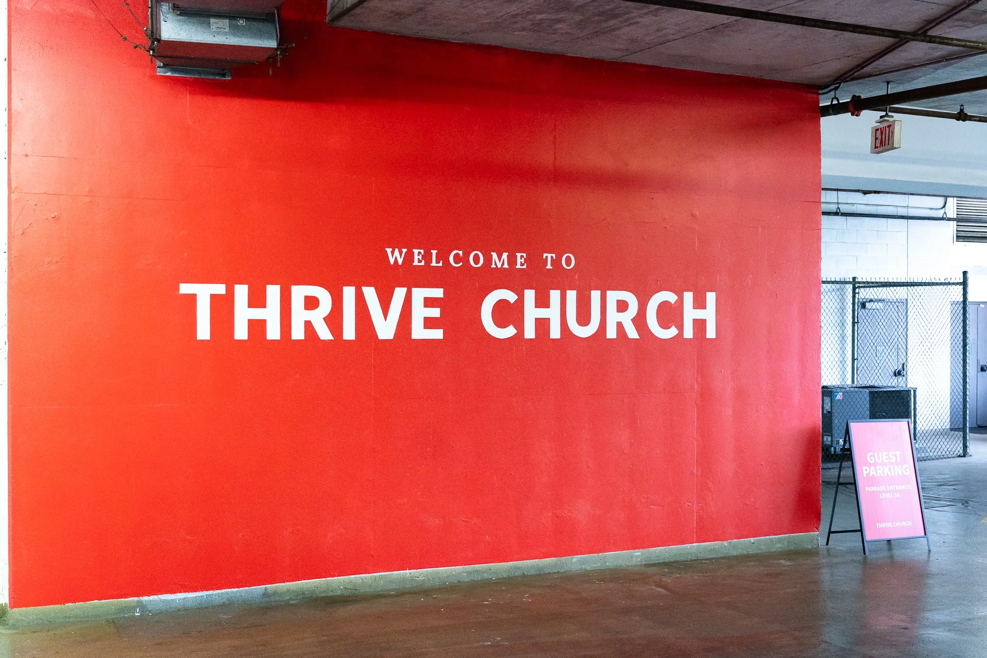You'll see the Thrive Church entrance there beside a BIG RED WALL that says “Welcome to Thrive Church”.